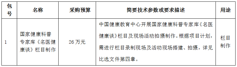 中国健康教育中心就 “国家健康科普专家库《名医健康谈》栏目制作”进行比选采购,现邀请合格供应商参加比选响应。