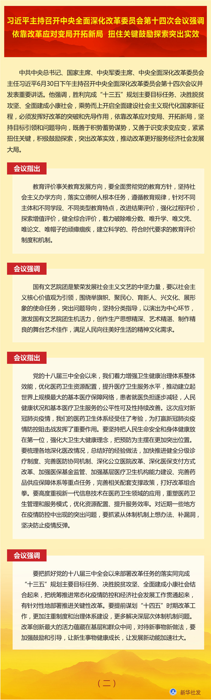 新华社北京6月30日电  中共中央总书记、国家主席、中央军委主席、中央全面深化改革委员会主任习近平6月30日下午主持召开中央全面深化改革委员会第十四次会议并发表重要讲话。他强调,胜利完成“十三五”规划主要目标任务、决胜脱贫攻坚、全面建成小康社会,乘势而上开启全面建设社会主义现代化国家新征程,必须发挥好改革的突破和先导作用,依靠改革应对变局、开拓新局,坚持目标引领和问题导向,既善于积势蓄势谋势,又善于识变求变应变,紧紧扭住关键,积极鼓励探索,突出改革实效,推动改革更好服务经济社会发展大局。
