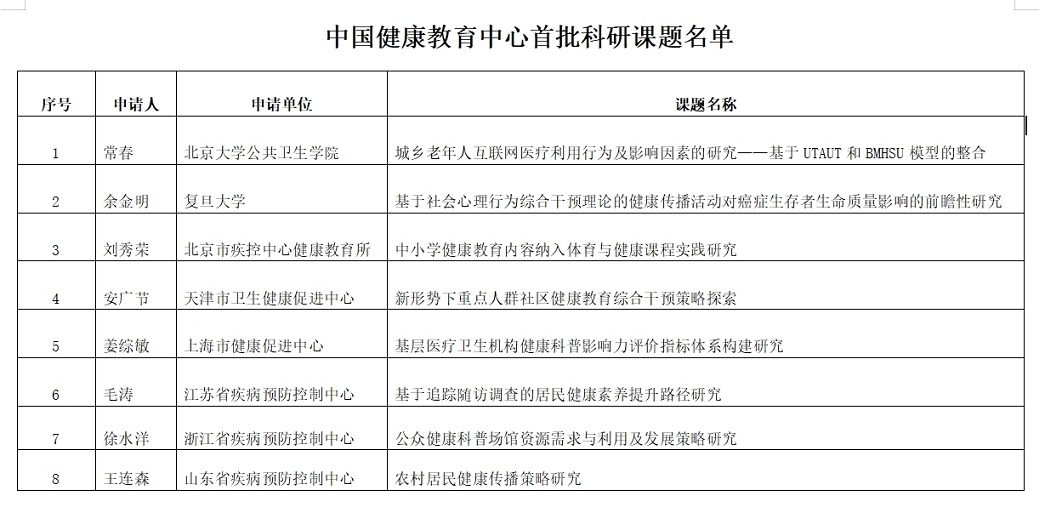 中国健康教育中心公布第一批联合研究项目名单