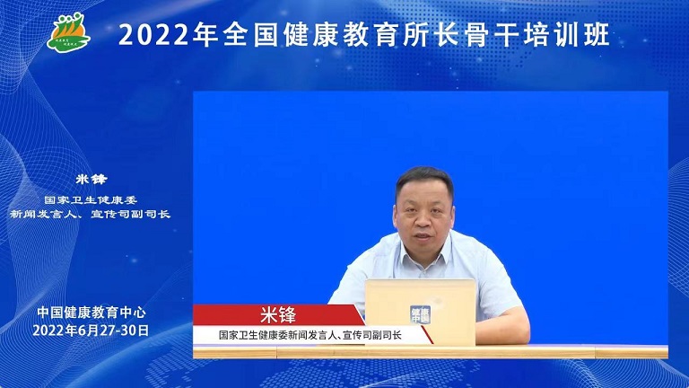 为加强全国健康教育人才队伍能力建设,为实施健康中国战略做好技术支撑,2022年6月27—30日,中国健康教育中心(以下简称“中心”)采用线上线下相结合的方式,举办2022年全国健康教育所长骨干培训班,来自全国31个省(自治区、直辖市)和新疆生产建设兵团的800余名省级健康教育所长和业务技术骨干参加培训。