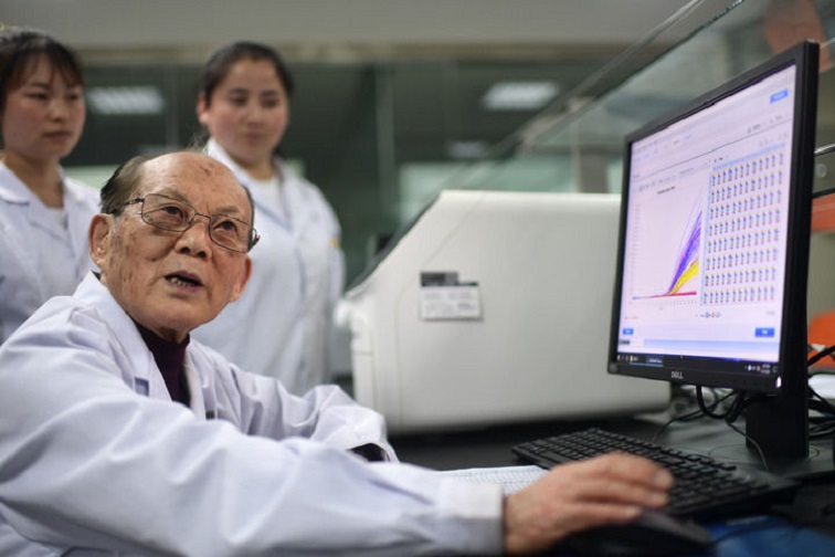 吴天一(前)在青海西宁的实验室内和学生讨论(2021年6月17日摄)。新华社记者张宏祥摄
