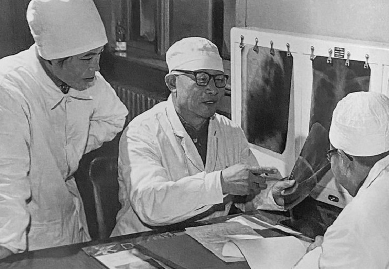 1980年1月16日,辛育龄(中)在内蒙古结核病院与胸外科医师讨论病例(翻拍照片)。新华社发