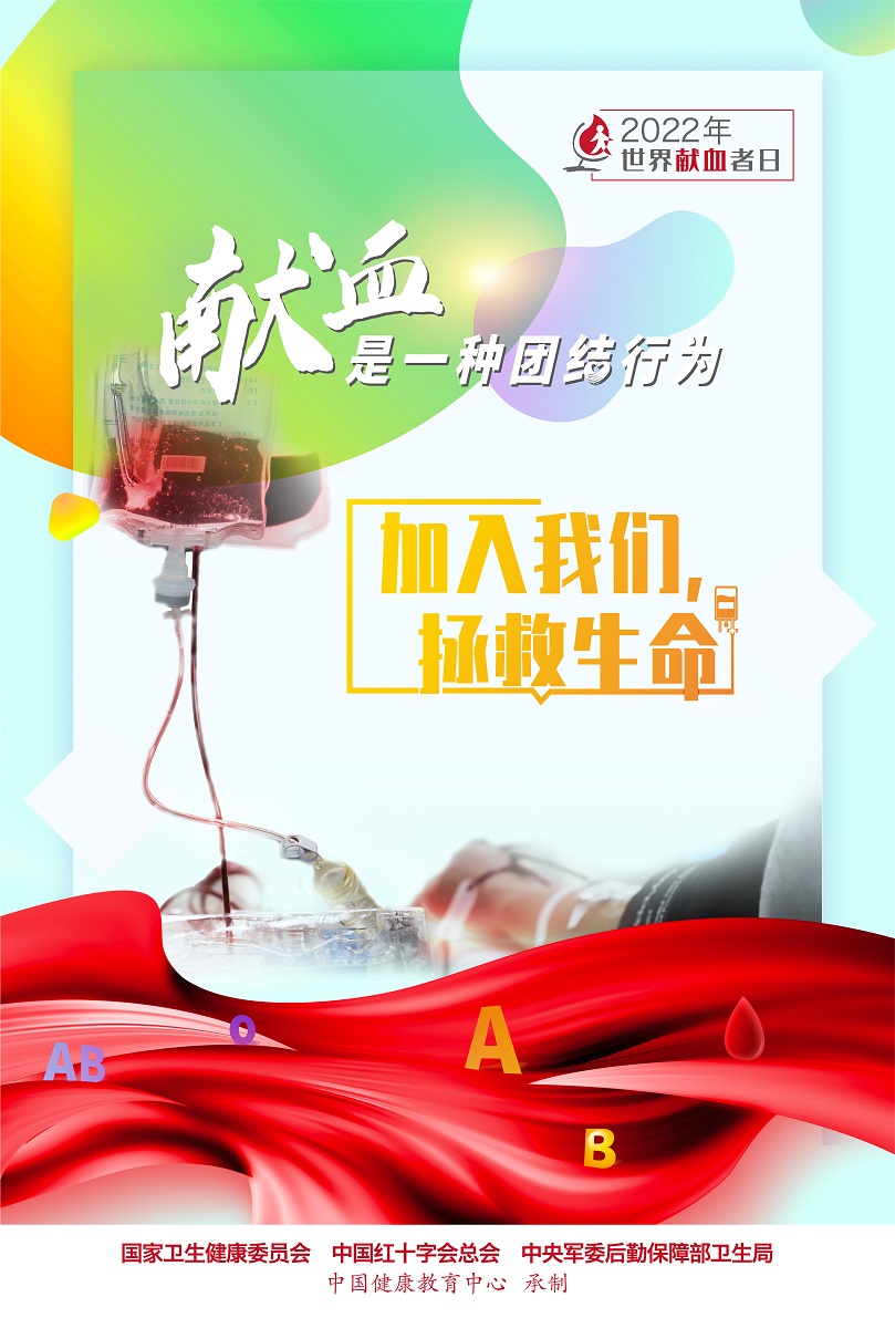 2022年6月14日是第19个世界献血者日,主题为“献血是一种团结行为。加入我们,拯救生命”。在国家卫生健康委医政医管局指导下,中国健康教育中心开发制作无偿献血宣传海报,呼吁更多人参与到无偿献血行动中来。